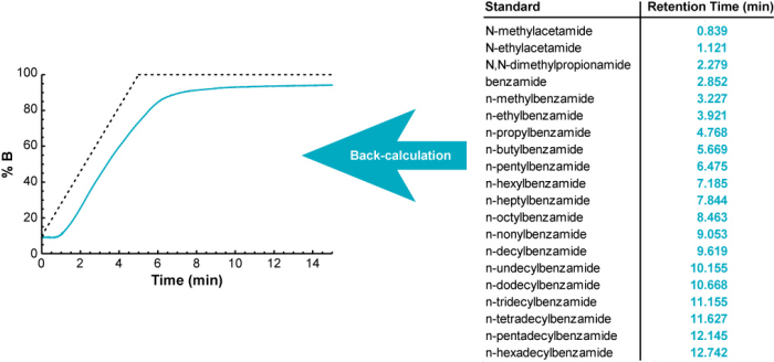 The Measure Your Gradient methodology uses the same basic approach, but in reverse. Instead of calculating gradient retention times from a measured gradient profile, it back-calculates what the gradient profile must have been to give a set of measured gradient retention times.