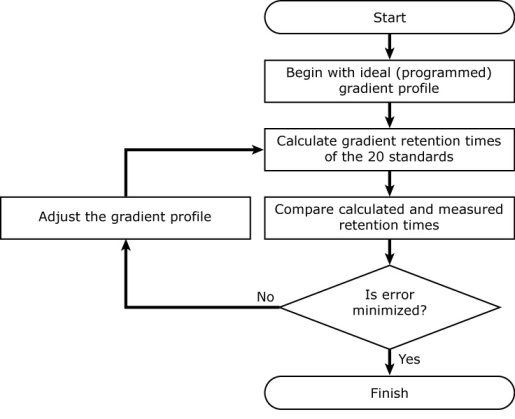 It uses an iterative process to back-calculate the gradient profile. It begins with the ideal (programmed) gradient profile, calculates retention times for each of 20 standards (using their known isocratic retention behavior; see below), and compares them with their measured retention times. Then it makes a small adjustment to the gradient profile, recalculates retention times for all 20 compounds, and checks to see if the accuracy of the calculated retention times improved. If so, it keeps the change, otherwise it discards it. It continues making small adjustments to the gradient profile until the difference between the measured and calculated retention times is minimized.