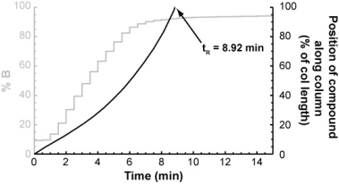For each isocratic step, you could determine the compound's retention factor (from the isocratic retention vs. % B relationship above) and from that, calculate how far it will travel through the column during the step. After a number of isocratic steps, the compound will eventually have traveled the entire length of the column.