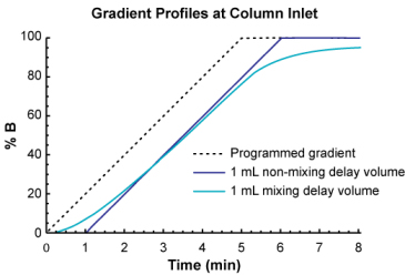 To understand its effect on the gradient profile, consider a gradient in which the fraction of solvent B increases linearly over the course of the experiment. As eluent with a higher amount of solvent B enters the mixing volume, it mixes with eluent of a lower solvent B fraction left over in the mixer. This causes the gradient profile reaching the column to not only be delayed, but also rounded, or dispersed.