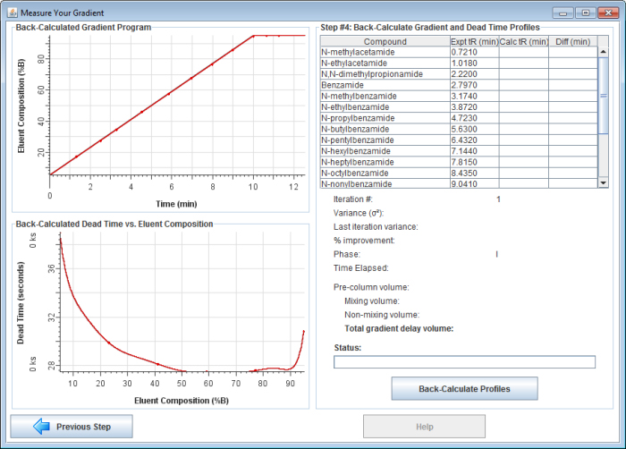 6) Click on the "Back-Calculate Profiles" button to begin back-calculating the gradient. First, the gradient delay is back-calculated. The gradient delay volume is the sum of all the volume in the tubing, connectors, and pump that is between the point where the solvent is proportioned and the column inlet. The gradient delay volume causes a delay between the time the HPLC pump is programmed to produce a certain solvent composition and when it actually reaches the column.