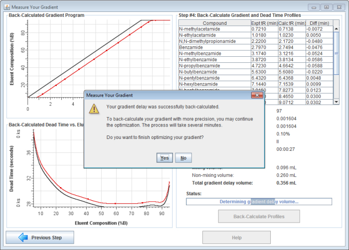 6) Click on the "Back-Calculate Profiles" button to begin back-calculating the gradient. First, the gradient delay is back-calculated. The gradient delay volume is the sum of all the volume in the tubing, connectors, and pump that is between the point where the solvent is proportioned and the column inlet. The gradient delay volume causes a delay between the time the HPLC pump is programmed to produce a certain solvent composition and when it actually reaches the column.