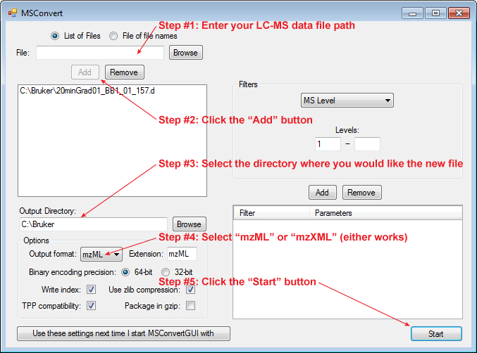 After installing ProteoWizard, you will have a new program group for ProteoWizard in your start menu. Find the program called "MSConvert" and run it. Then follow the instructions below: